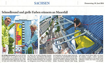 Dieser kurze TV-Ausschnitt (0:35 min) des Senders mdr Sachsenspiegel zeigt die Kunstaktion mit dem Berliner Künstler Thierry Noir am Cityhochhaus Chemnitz. Die Idee stammt von René König, die größte Reproduktion des Künstlers nicht in Berlin, sondern in Chemnitz anlässlich des 25. Jahrestages zum Bau der Berliner Mauer zu realisieren. Thierry Noir zählt zu den bekanntesten Westberliner Künstlern, die die Mauer großflächig bemalt haben.