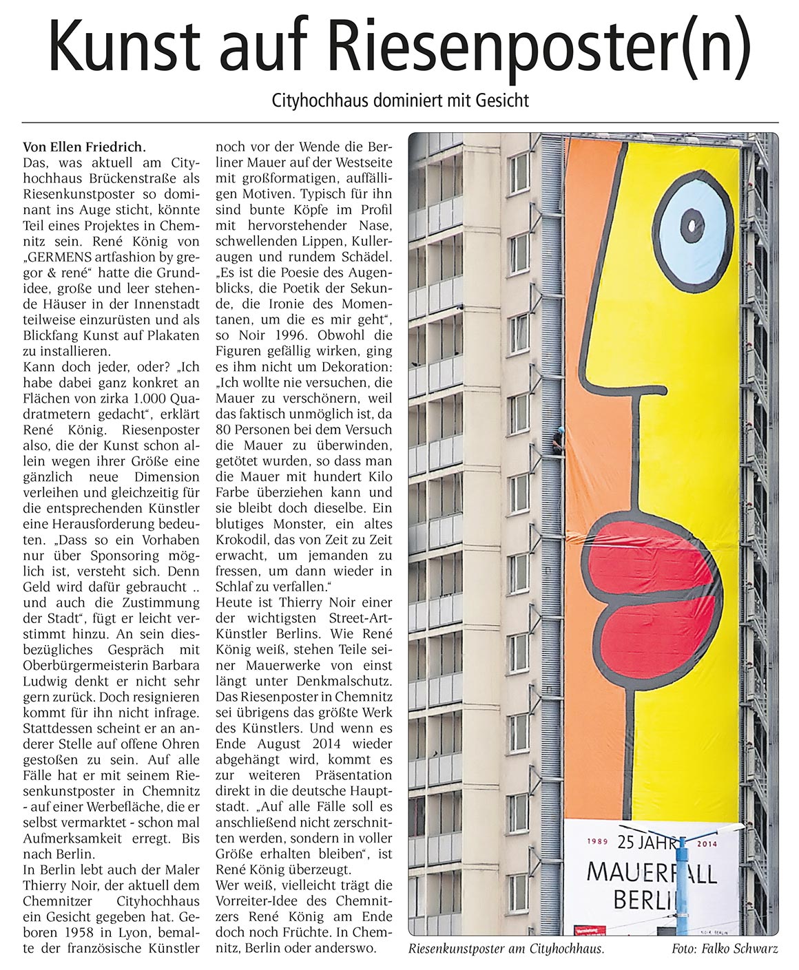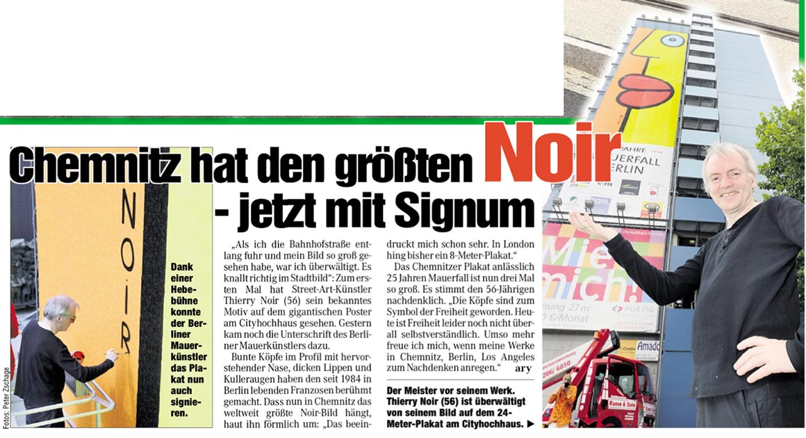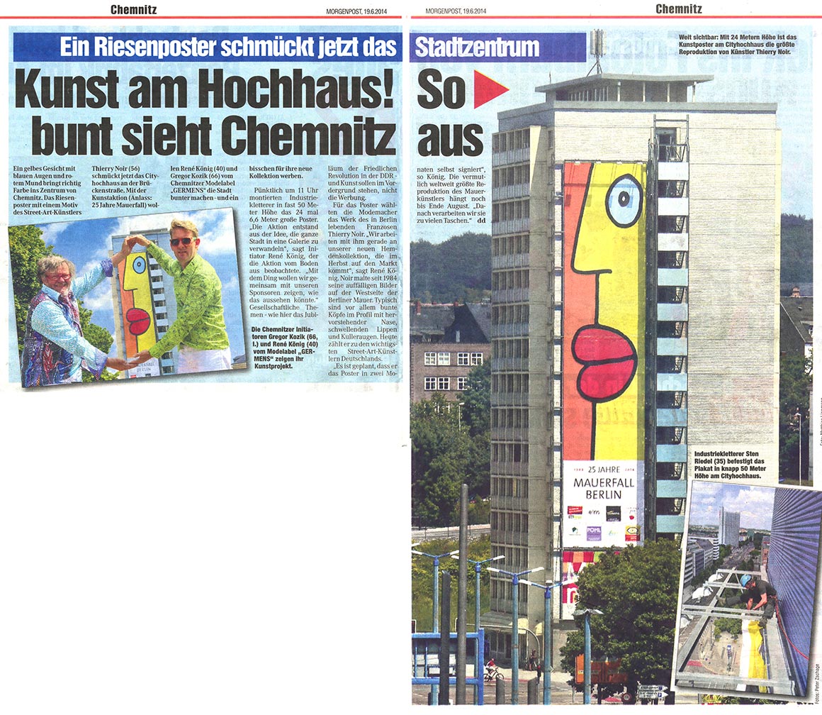 Dieser kurze TV-Ausschnitt (0:35 min) des Senders mdr Sachsenspiegel zeigt die Kunstaktion mit dem Berliner Künstler Thierry Noir am Cityhochhaus Chemnitz. Die Idee stammt von René König, die größte Reproduktion des Künstlers nicht in Berlin, sondern in Chemnitz anlässlich des 25. Jahrestages zum Bau der Berliner Mauer zu realisieren. Thierry Noir zählt zu den bekanntesten Westberliner Künstlern, die die Mauer großflächig bemalt haben.
