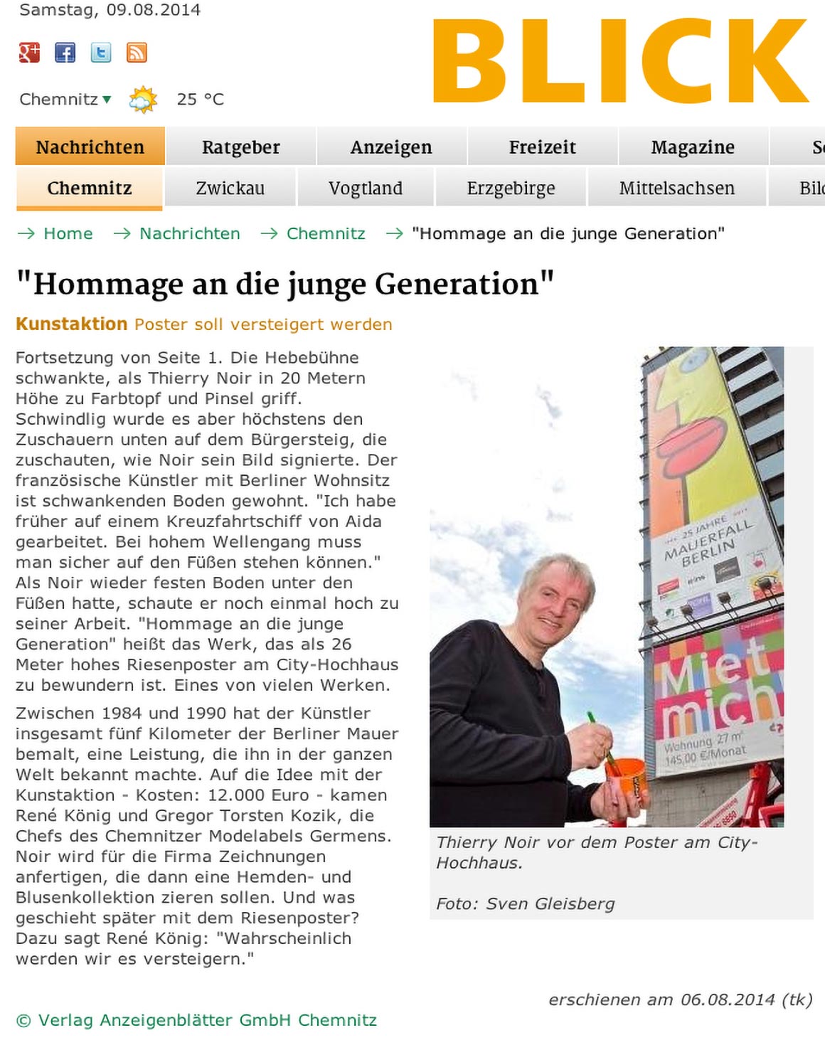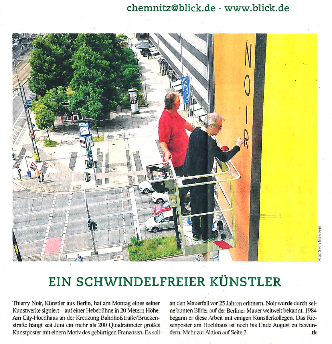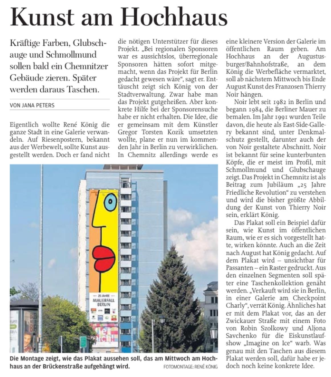 Dieser kurze TV-Ausschnitt (0:35 min) des Senders mdr Sachsenspiegel zeigt die Kunstaktion mit dem Berliner Künstler Thierry Noir am Cityhochhaus Chemnitz. Die Idee stammt von René König, die größte Reproduktion des Künstlers nicht in Berlin, sondern in Chemnitz anlässlich des 25. Jahrestages zum Bau der Berliner Mauer zu realisieren. Thierry Noir zählt zu den bekanntesten Westberliner Künstlern, die die Mauer großflächig bemalt haben.